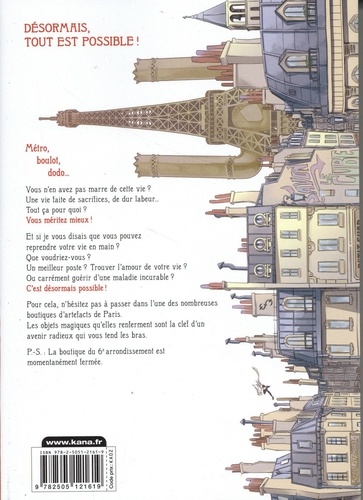 DESORMAIS, TOUT EST POSSIBLE ! Métro, boulot, dodo... Vous n'en avez pas marre de cette vie ? Une vie faite de sacrifices, de dur labeur... Tout ça pour quoi ? Vous méritez mieux ! Et si je vous disais que vous pouvez reprendre votre vie en main ? Que voudriez-vous ? Un meilleur poste ? Trouver l'amour de votre vie ? Ou carrément guérir d'une maladie incurable ? C'est désormais possible ! Pour cela, n'hésitez pas à passer dans l'une des nombreuses boutiques d'artefacts de Paris. Les objets magiques qu'elles renferment sont la clef d'un avenir radieux qui vous tend les bras. P-S. : La boutique du 6e arrondissement est momentanément fermée.