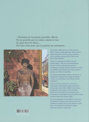 1969, point de rupture pour Pier Paolo Pasolini et Maria Callas. Eux qui ont chacun été des icônes des milieux artistiques et culturels voient leurs carrières se déliter, leurs lumières ternir, et leurs amours échouer. Autour d'eux, c'est la danse des passions compliquées, des gens usés par les sentiments et le cinéma, Elizabeth Taylor et Richard Burton, Jacky et Onassis, le clan Kennedy... Ils se croisent, le temps du tournage éprouvant de Médée, où l'un est réalisateur et l'autre joue le rôle-titre. C'est la naissance d'une relation atypique et complexe entre ces deux figures aux vies tourmentées. Un amour platonique, intense, qui s'épanouit le temps d'un voyage au Brésil, comme une parenthèse dans leurs destins tragiques. L'occasion pour eux de se ressourcer et de découvrir un univers fascinant et dangereux, aux antipodes des sphères mondaines italiennes auxquelles ils sont habitués. Avec Un Amour impossible, Jean Dufaux peut librement exprimer son amour pour le cinéma et la poésie en romançant la touchante histoire de deux icônes de la scène artistique des années 60. Sara Briotti est une jeune dessinatrice italienne. Son amour pour sa ville natale, Rome, l'aide à sublimer les ambiances chaudes de la dolce vita italienne.