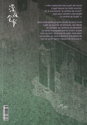 "Mon restaurant est ouvert de minuit à sept heures du matin environ. On le surnomme la cantine de minuit" mais pour certains c'est plutôt "la cantine de l'aube" ". Dans cette petite gargote située au fond d'une ruelle du quartier de Shinjuku, les clients se croisent, les histoires se dévoilent. La carte ne propose que du tonjiru, soupe miso au porc, ainsi que du saké, mais selon vos envies, on vous préparera à la demande tout ce qu'on est en mesure de vous servir.