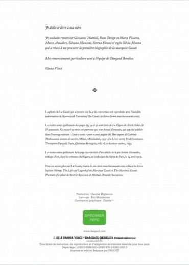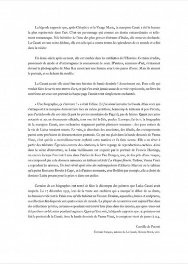 Luisa Casati Amman, passée à la postérité sous le nom de "La Casati", dilapida un immense patrimoine, dans le seul dessein de devenir une oeuvre d'art vivante. Ses apparitions sulfureuses, ses tenues choquantes et ses fêtes pharaoniques la firent entrer dans la légende. Un personnage qui marqua les mémoires, sorte de Lady Gaga de la Belle Epoque.