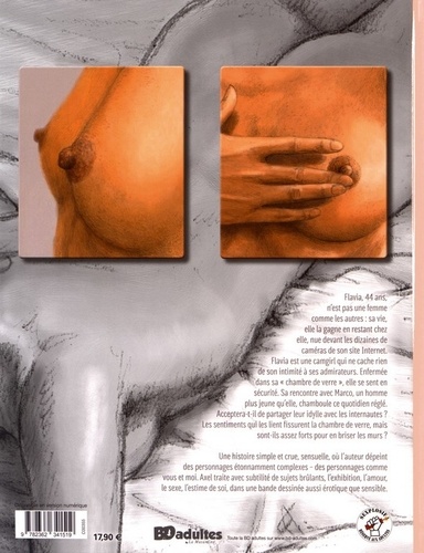 Flavia, 44 ans, n'est pas une femme comme les autres : sa vie, elle la gagne en restant chez elle, nue devant les dizaines de caméras de son site Internet. Flavia est une camgirl qui ne cache rien de son intimité à ses admirateurs. Enfermée dans sa "chambre de verre", elle se sent en sécurité. Sa rencontre avec Marco, un homme plus jeune qu'elle, chamboule ce quotidien réglé. Acceptera-t-il de partager leur idylle avec les internautes ? Les sentiments qui les lient fissurent la chambre de verre, mais sont-ils assez forts pour en briser les murs ? Une histoire simple et crue, sensuelle, où l'auteur dépeint des personnages étonnamment complexes – des personnages comme vous et moi. Axel traite avec subtilité de sujets brûlants, l'exhibition, l'amour, le sexe, l'estime de soi, dans une bande dessinée aussi érotique que sensible.