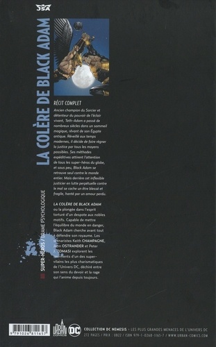 Ancien champion du Sorcier et détenteur du pouvoir de l'éclair vivant, Teth-Adam a passé de nombreux siècles dans un sommeil magique, rêvant de son Egypte antique. Réveillé aux temps modernes,i il décide de faire régner la justice par tous les moyens possibles. Ses méthodes expéditives attirent l'attention de tous les super-héros du globe, et sous peu, Black Adam se retrouve seul contre le monde entier. Mais derrière cet inflexible justicier en lutte perpétuelle contre le mal se cache un être blessé et fragile, hanté par un amour perdu. La colère de Black Adam ou la plongée dans l'esprit torturé d'un despote aux nobles motifs. Capable de mettre l'équilibre du monde en danger, Black Adam cherche avant tout défendre son royaume. Les scénaristes Keith Champagne, John Ostrander et Peter J. Tomasi explorent les tourments d'un des super-vilains les plus charismatiques de l'Univers DC, déchiré entre son sens du devoir et la rage qui l'anime depuis toujours.