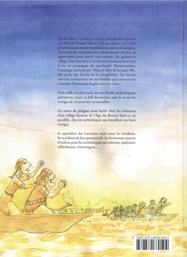 Devoir obéir à Groud qui veut la contraindre à épouser et idiot de Donas ? Mina a fait son choix : si le Chef prétentieux parvient à transformer la course de pirogues, joute amicale réunissant les communautés locales, en opportunité pour asseoir son autorité, elle quittera le village. Peut-être avec le mystérieux inconnu arrivé par le lac en compagnie du marchand ? Heureusement, l'équipage emmené par Olias, le frère de la jeune fille, fait partie des favoris de la compétition. Sa victoire mettrait certainement fin aux bisbilles qui commencent lézarder l'harmonie fragile entre les clans. Trois mille ans plus tard, sur une fouille archéologique préventive, Lucie et Jeff découvrent sans le savoir les vestiges de ces journées mémorables. La course de pirogues vous invite chez les habitants d'un village lacustre de l'Age du Bronze final et, en parallèle, chez les archéologues qui travaillent sur leurs vestiges. Le quotidien des Lacustres, mais aussi les incidents, les accidents de leur parcours de vie deviennent sources d'indices pour les archéologues qui relèvent, analysent, réfléchissent, s'interrogent...