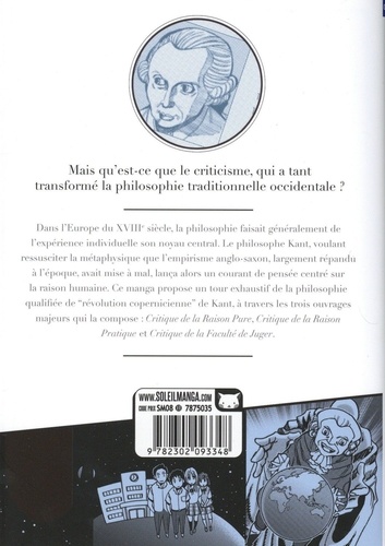 Alors que la métaphysique a été dynamitée par l'empirisme, Emmanuel Kant commence à étudier la raison humaine afin de lui rendre ses lettres de noblesse. Il décortique avec brio un florilège de concepts qui révolutionneront à jamais la philosophie occidentale. Avec toutes les notions-clefs transposées en cas concrets très actuels dans ce manga, la philosophie n'aura jamais été aussi accessible et divertissante !
