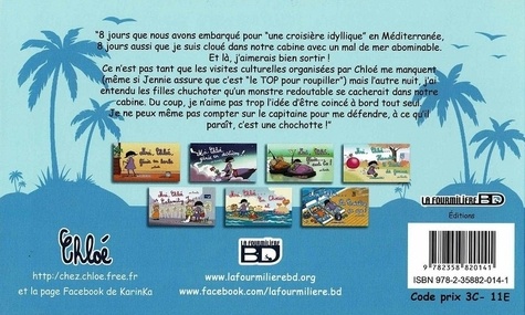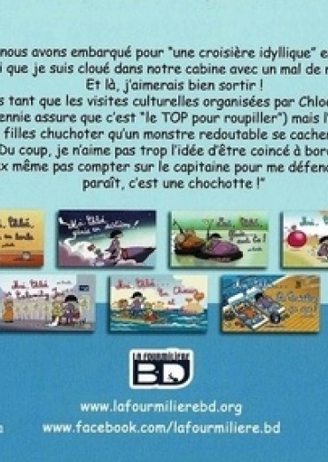 "8 jours que nous avons embarqué pour "une croisière idyllique" en Méditerranée, 8 jours aussi que je suis cloué dans notre cabine avec un mal de mer abominable. Et là, j'aimerais bien sortir ! Ce n'est pas tant que les visites culturelles organisées par Chloé me manquent (même si Jennie assure que c'est "le TOP pour roupiller") mais l'autre nuit j'ai entendu les filles chuchoter qu'un monstre redoutable se cacherait dans notre cabine. Du coup, je n'aime pas trop l'idée d'être coincé à bord tout seul. Je ne peux même pas compter sur le capitaine pour me défendre, à ce qu'il paraît, c'est une chochotte ! "
