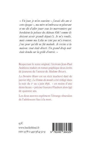 Respectant le texte original, l'écrivain Jean-Paul Andrieux traduit en roman graphique deux écrits de jeunesse de l'auteur de Madame Bovary. La Dernière heure est un récit inachevé daté de janvier 1837. La Femme du monde a été rédigé dans la nuit du 1er au 2 juin 1836, "en moins d'une demi-heure" précise Gustave Flaubert alors âgé de quatorze ans. Les deux oeuvres expriment l'étrange obsession de l'adolescent face à la mort.