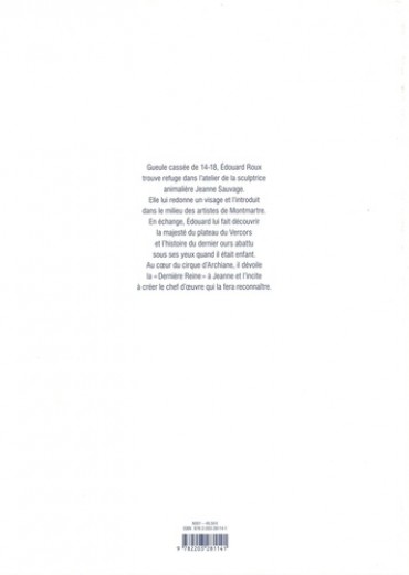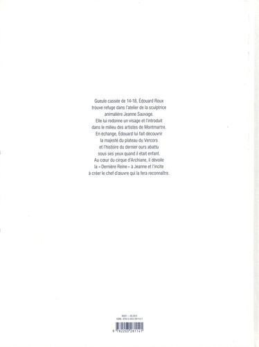 Gueule cassée de 14, Edouard Roux trouve refuge dans l'atelier de la sculptrice animalière Jeanne Sauvage. Elle lui redonne un visage et l'introduit dans le milieu des artistes de Montmartre. En échange, Edouard lui fait découvrir la majesté du plateau du Vercors et l'histoire du dernier ours qu'il a vu tué quand il était enfant. Au coeur du Cirque d'Archiane, il lui dévoile la Dernière Reine et incite Jeanne a créer le chef d'oeuvre qui la fera reconnaître. Dans la veine des grands romans feuilletons du 19 ? , La Dernière Reine croise les destins du dernier ours du Vercors et d'Edouard Roux gueule cassée de 14.