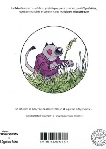 Fruit d'une belle rencontre entre édition et presse indépendantes, La Détonte est un recueil de strips de B-gnet parus dans le journal L'âge de faire, publié en coédition avec les éditions Rouquemoute. Mensuel imprimé à plus de 16000 exemplaires (9000 abonnés et 7000 exemplaires distribués via un réseau alternatif de diffuseurs), L'âge de faire est édité par une société coopérative (SCOP). Ce canard écolo, militant, solidaire et joyeux comprend 24 pages d'articles écrits en totale indépendance et épargnés de toute pollution publicitaire. Maison d'édition de bandes dessinées indépendante, Rouquemoute mise sur le local et l'anti-gaspi, avec une ligne éditoriale estampillée humour. Ses livres sont imprimés à moins de 100 km de ses bureaux nantais, à l'imprimerie Pollina, en Vendée. Les strips de B-gnet sont publiés dans L'âge de faire depuis 2016. Décalé, délirant, décidé parfois et volontiers fainéant, le personnage qu'il a créé promène les lecteurs dans la Nature, dans son jardin, ou simplement dans son salon, mais la ville n'est jamais loin. Au gré des cases, il pointe les contradictions de notre société connectée, artificielle, et se régale du "fais-le-toi-même".