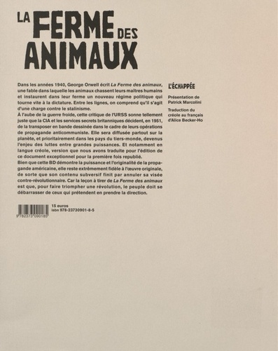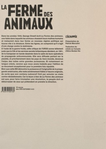 Dans les années 1940, George Orwell écrit La Ferme des animaux, une fable dans laquelle les animaux chassent leurs maîtres humains et instaurent dans leur ferme un nouveau régime politique qui tourne vite à la dictature. Entre les lignes, on comprend qu'il s'agit d'une charge contre le stalinisme. A l'aube de la guerre froide, cette critique de l'URSS sonne tellement juste que la CIA et les services secrets britanniques décident, en 1951, de la transposer en bande dessinée dans le cadre de leurs opérations de propagande anticommuniste. Elle sera diffusée partout sur la planète, et prioritairement dans les pays du tiers-monde, devenus l'enjeu des luttes entre grandes puissances. Et notamment en langue créole, version que nous avons traduite pour l'édition de ce document exceptionnel pour la première fois republié. Bien que cette BD démontre la puissance et l'originalité de la propagande américaine, elle reste extrêmement fidèle à l'oeuvre originale, de sorte que son contenu subversif finit par annuler sa visée contre-révolutionnaire. Car la leçon à tirer de La Ferme des animaux est que, pour faire triompher une révolution, le peuple doit se débarrasser de ceux qui prétendent en prendre la direction.