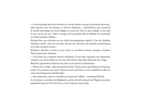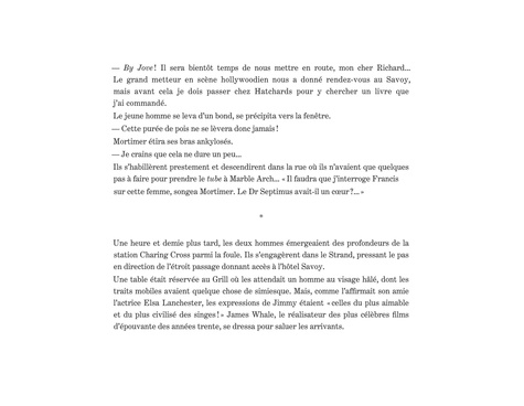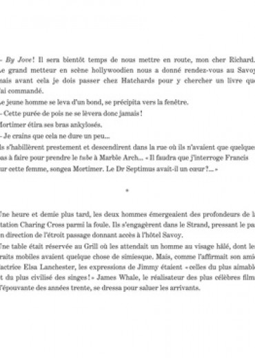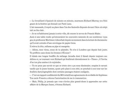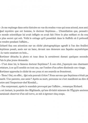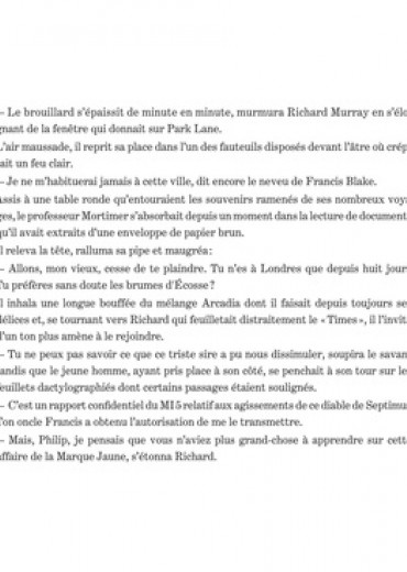 A Londres, Philip Mortimer et le jeune Richard, neveu de Francis Blake, dînent avec James Whale. Le réalisateur de L'Homme invisible prépare un film consacré à la célèbre affaire de la " Marque Jaune ". En sortant de l'hôtel, Mortimer et Richard manquent de se faire écraser par une voiture sans conducteur. Dans la nuit, James Whale est réveillé par une voix féminine psalmodiant à la radio une phrase en forme de menace. Intrigué, Mortimer téléphone à Blake. Celui-ci lui apprend que le docteur Septimus avait une collaboratrice : une biologiste nommée Ursula Phelps. Etrange coïncidence, Richard a récemment lu un article signé " Phelps ", expliquant que l'électricité organique pouvait déplacer des objets à distance. Bien décidés à éclaircir ce mystère, les trois hommes s'aventurent jusqu'au cottage abandonné du docteur Septimus. Dans le désordre de son laboratoire, ils vont découvrir son oeuvre ultime... Avec cette nouvelle mêlant l'humour au surnaturel, François Rivière, biographe d'Edgar P. Jacobs, et Jean Harambat, auteur des remarqués Opération Copperhead et Detection Club, rendent hommage au cinéma fantastique et à la littérature populaire des années 30. Une histoire savoureuse au ton so british, illustrée par les dessins de Jean Harambat, son trait léger et ses couleurs subtiles.