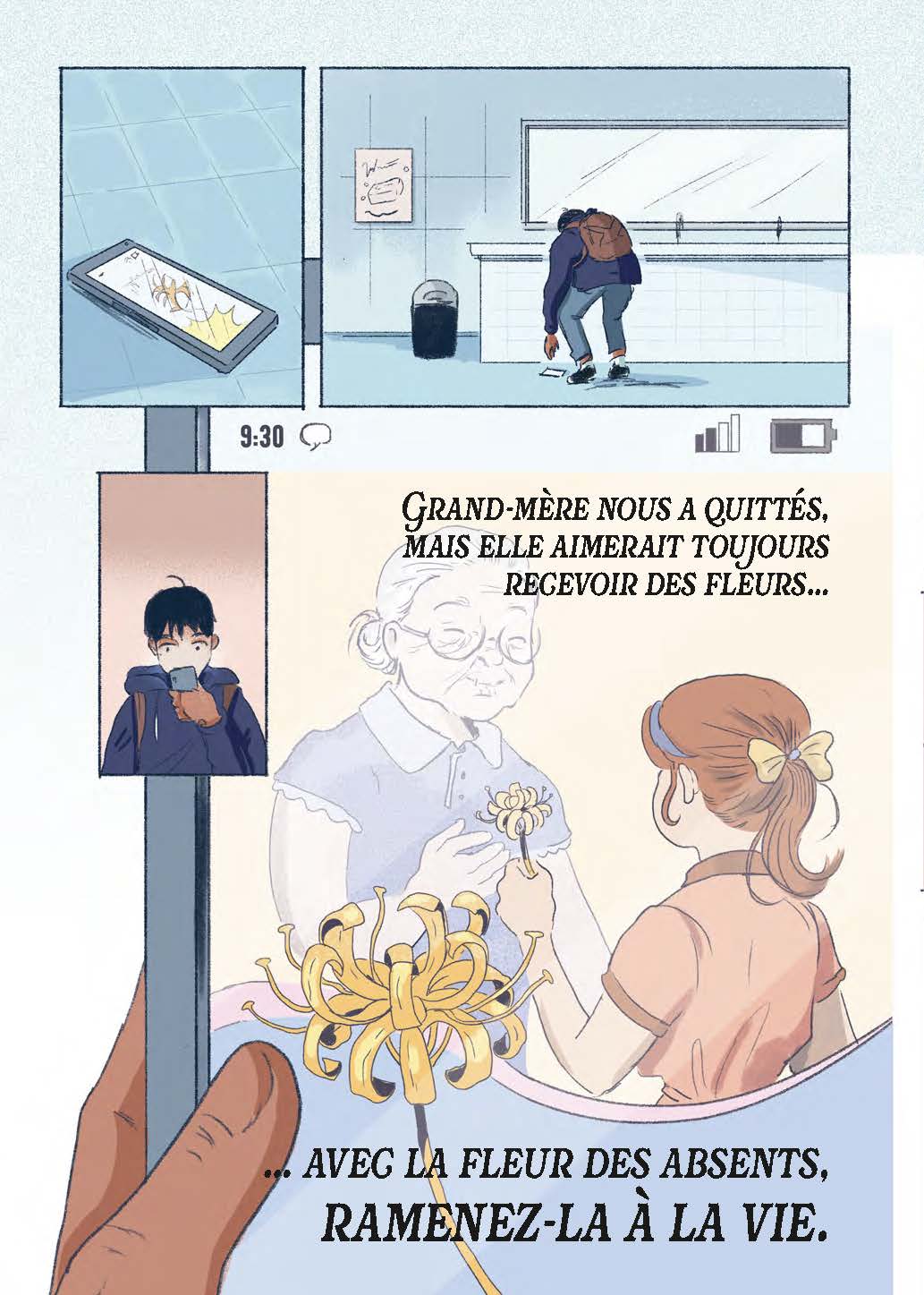 Depuis le décès de sa mère, la vie de Damian est complexe : son père a refait sa vie et le jeune homme n'est pas le bienvenu dans sa nouvelle famille. Recueilli par Lou, son grand-père, il doit assumer le statut de " nouveau " au lycée. Pas simple quand on est déjà un grand timide... Mais l'acquisition d'une fleur des absents va bousculer ce nouvel ordre. Cette fleur doit lui permettre d'invoquer le fantôme de sa mère, mais contre toute attente, Damian se retrouve avec celui de Saskia sur les bras, une jeune gamine au caractère bien trempé et à la mort chargée de mystère. Débute alors une cohabitation forcée haute en couleurs pour ces deux êtres que tout oppose. Obligés de démêler mensonges et non-dits, ils découvriront que leur trajectoire n'est finalement pas si éloignée, tous deux cherchant à clarifier le passé, l'un pour se forger un avenir, l'autre pour peut-être, enfin, trouver la paix.