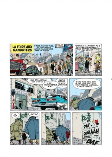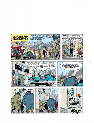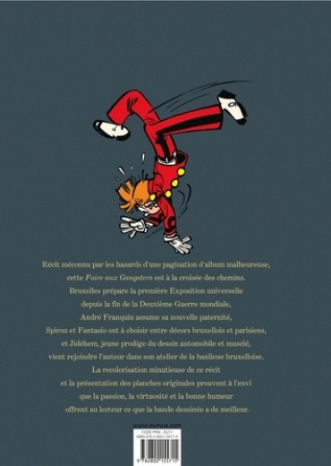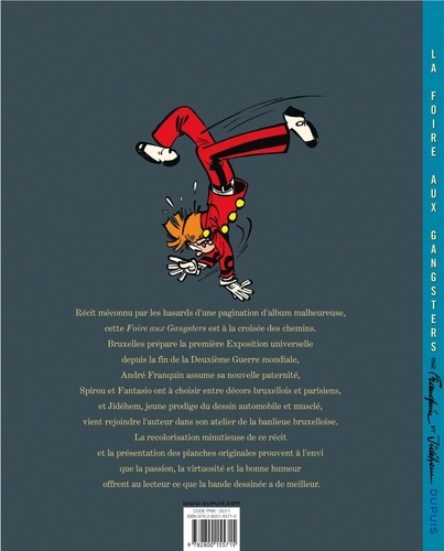 Récit méconnu par les hasards d'une pagination d'album malheureuse, cette Foire aux Gangsters est à la croisée des chemins. Bruxelles prépare la première Exposition universelle depuis la fin de la Deuxième Guerre mondiale, André Franquin assume sa nouvelle paternité, Spirou et Fantasio ont à choisir entre décors bruxellois et parisiens, et Jidéhern, jeune prodige du dessin automobile et musclé, vient rejoindre l'auteur dans son atelier de la banlieue bruxelloise. La recolorisation minutieuse de ce récit et la présentation des planches originales prouvent à l'envi que la passion, la virtuosité et la bonne humeur offrent au lecteur ce que la bande dessinée a de meilleur.