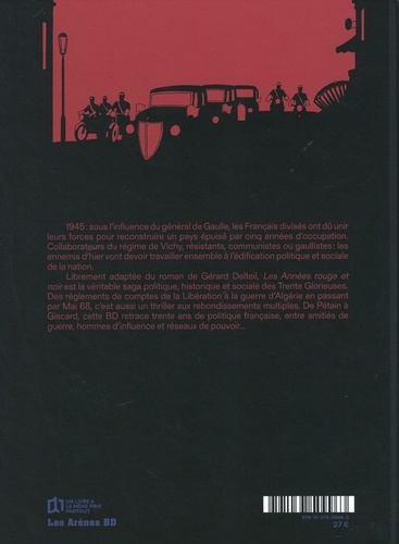 1945 : sous l'influence du général de Gaulle, les Français divisés ont dû unir leurs forces pour reconstruire un pays épuisé par cinq années d'occupation. Collaborateurs du régime de Vichy, résistants, communistes ou gaullistes : les ennemis d'hier vont devoir travailler ensemble à l'édification politique et sociale de la nation. Librement adaptée du roman de Gérard Delteil, Les Années rouge et noir est la véritable saga politique, historique et sociale des Trente Glorieuses. Des règlements de comptes de la Libération à la guerre d'Algérie en passant par Mai 68, c'est aussi un thriller aux rebondissements multiples. De Pétain à Giscard, cette BD retrace trente ans de politique française, entre amitiés de guerre, hommes d'influence et réseaux de pouvoir...