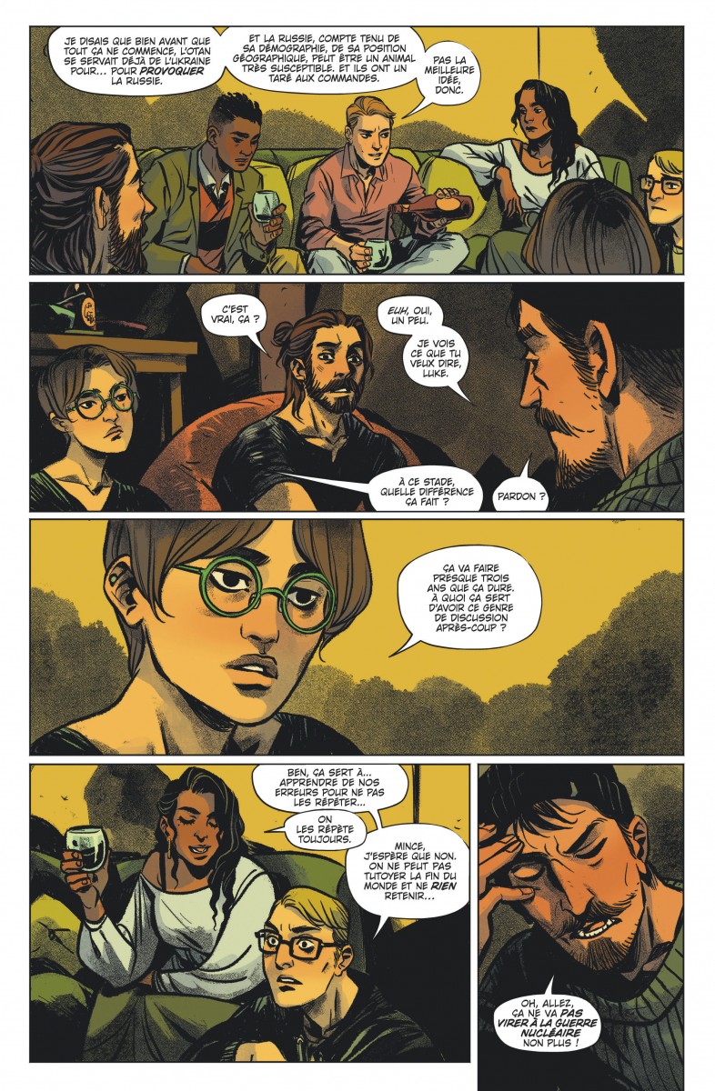 New York. Huit amis réunis autour d'un verre échangent vivement sur l'actualité, les décisions prises par les puissants de ce monde et les rumeurs plus ou moins complotistes qui circulent sur les réseaux sociaux. Chacun y va de ses spéculations, les plus optimistes comme les plus alarmistes, sans se douter que le danger n'est désormais plus une crainte abstraite, mais bien un danger imminent venu frapper sur leur sol. L'apocalypse, c'est pour maintenant.