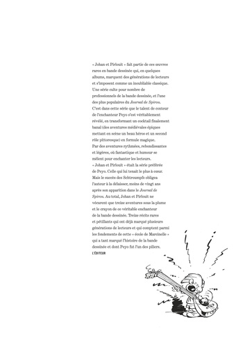 Les années 1960 voient une révolution s'opérer dans le petit monde du journal SPIROU. Les Schtroumpfs font de leur dessinateur, Peyo, un entrepreneur qui doit gérer un univers complexe et toujours plus éloigné de la bande dessinée. Créateur prolifique, Peyo avait inventé de nombreux personnages avant ses célèbres lutins bleus. Avec le succès des Schtroumpfs, l'auteur va malheureusement devoir les délaisser, même Johan et Pirlouit, ses héros favoris, pour les remettre aux bons soins d'un "studio Peyo". Les quatre albums réunis dans ce volume de l'intégrale Johan et Pirlouit sont les derniers réalisés par le génial Peyo lui-même. Cette intégrale comprend : La guerre des 7 fontaines (tome 10) L'anneau des Castellac (tome 11) Le pays maudit (tome 12) Le sortilège de Maltrochu (tome 13) Avec, en complément, un dossier et des histoires courtes