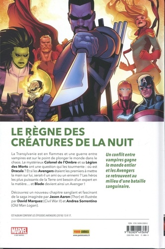 Le règne des créatures de la nuit. La Transylvanie est en flammes et une guerre entre vampires est sur le point de plonger le monde dans le chaos. Le mystérieux Colonel de l'Ombre et sa Légion des Morts ont une question qui les tourmente : où est Dracula ? Et si les Avengers étaient les premiers à mettre la main sur lui, serait-il un ami ou un ennemi ? Les héros les plus puissants de la Terre ont besoin d'un expert en la matière... et Blade devient ainsi un Avenger ! Découvrez un nouveau chapitre sanglant et fascinant de la saga imaginée par Jason Aaron (Thor) et illustrée par David Marquez (Civil War II) Met Andrea Sorrentino (Old Man Logan). Cet album contient les épisodes Avengers (2018) 13 à 17. Un conflit entre vampires gagne le monde entier et les Avengers se retrouvent au milieu d'une bataille sanguinaire.