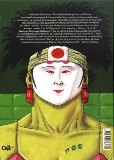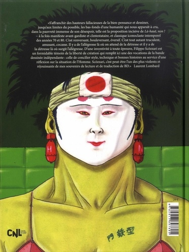 "S'affranchir des hauteurs fallacieuses de la bien-pensance et dessiner, jusqu'aux limites du possible, les bas-fonds d'une humanité qui nous apparait à cru, dans la pauvreté immense de son désespoir, telle est la proposition incisive de Là-haut, non ! - à la fois manifeste avant-gardiste et contestataire, et classique iconoclaste intemporel des années 70 et 80. C'est renversant, bouleversant, éversif. C'est tout autant truculent, amusant, cocasse. Il y a de l'allégresse là on on attend de la détresse et il y a de la détresse là où surgit l'allégresse. D'une inventivité à toute épreuve, Filippo Scozzari est un formidable témoin de la liberté de création qui remplit ici une des vocations de la bande dessinée indépendante : celle de concilier style, technique et bonnes histoires au service d'une réflexion sur la situation de l'Homme. Scozzari, c'est peut-être l'un des plus violents et réjouissants de mes souvenirs de lecture et de traduction de BD." Laurent Lombard