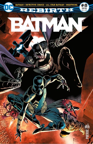 LA LIGUE DES OMBRES EST A GOTHAM ! Bruce Wayne passe quelques instants de détente dans un fast-foodavec les autres justiciers de Gotham. Ce qu'il ne sait pas, c'est que Bane s'apprête à se vengeraprès l'assaut de Santa Prisca, par Tom KING et David FINCH. La série DetectiveComicsfête son 950eépisode, consacré en grande partie à Orphan, une jeune héroïne en quête d'elle-même. De leur côté, Azraelet Batwingéchangent des informations sur leurs méthodes respectives. Enfin, dans une séquence de flash-back, RedRobin s'interroge sur la raison qui pousse Batman à se préparer à la guerre. L'épisode suivant, qui marque l'arrivée de la Ligue des Ombres, lui fournit une partie de la réponse, par James TYNION IV, Marcio TAKARA, Alvaro MARTINEZ, Eddy BARROWS et Christian DUCE. Tandis que Duke Thomas est confronté au Sphinx, Batman affronte MisterFreeze, par Scott SNYDER, JOCK et Francesco FRANCAVILLA. Installé à Blüdhaven, Nightwingaffronte MisterNice et trouve une bonne raison de rester dans la ville, par Tim SEELEY et Marcus TO.