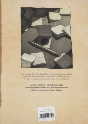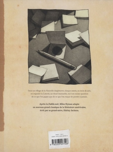 Dans un village de la Nouvelle-Angleterre, chaque année, au mois de juin, on organise la Loterie, un rituel immuable, où il est moins question de ce que l'on gagne que de ce que l'on risque de perdre à jamais. Après Le Dahlia noir, Miles Hyman adapte un nouveau grand classique de la littérature américaine, écrit par sa grand-mère, Shirley Jackson.