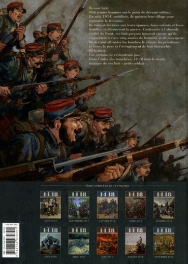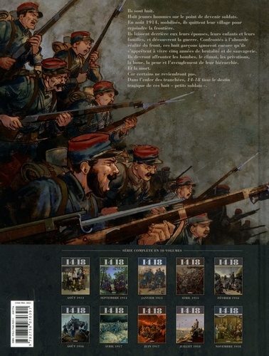 Dernier tome pour la série 14-18 qui a accompagné sans faillir le centenaire de la Grande Guerre, semestre après semestre, restituant la durée du conflit pour le lecteur fidèle. Mission accomplie messieurs les auteurs ! L'armistice permet enfin à Maurice, Pierre et Jules de rentrer au foyer. Ils sont les derniers de nos héros à quitter le théâtre de la guerre. Arsène et Louis sont déjà revenus, blessés, le premier une jambe en moins, le second la "gueule cassée" . Denis et Armand sont morts au combat et Jacques a été fusillé pour l'exemple. Mais la guerre, même conclue, n'a pas fini de faire des victimes...