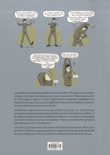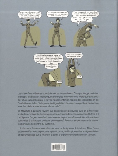 Les crises financières se succèdent et se ressemblent. Chaque fois, pour éviter le chaos, les Etats et les banques centrales interviennent. Mais que sauvent-ils ? Quel rapport cela a-t-il avec l'augmentation rapide des inégalités et de l'endettement des Etats, avec la dégradation des services publics, ou encore avec les résistances à travers le monde ? La Machine à détruire revient sur ces crises et ce qui les suit, et s'interroge sur la place croissante des banques et de la finance dans nos existences. Suffira-t-il de déplacer l'argent vers des investissements plus verts ? Les solutions financières sont-elles à la hauteur de leurs promesses ? Peut-on se permettre de laisser les banques au centre du système ? Loin de nous écraser avec des notions techniques et lointaines, Aline Fares et Jérémy Van Houtte proposent plutôt un regard limpide et des analyses drôles et documentées sur la finance, à partir d'expériences familières et vécues.