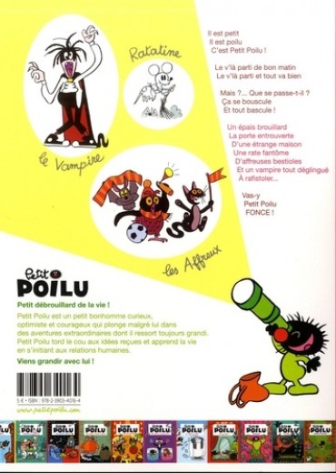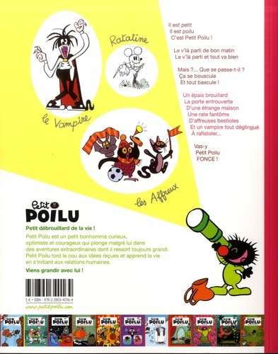 Il est petit, Il est poilu, C'est Petit Poilu ! Le v'là parti de bon matin Le v'là parti et tout va bien. Mais ? ... Que se passe-t-il ? Ca se bouscule, Et tout bascule ! Un épais brouillard, La porte entrouverte, D'une étrange maison, Une rate fantôme, D'affreuses bestioles, Et un vampire tout déglingué, A rafistoler... Vas-y, Petit Poilu FONCE !