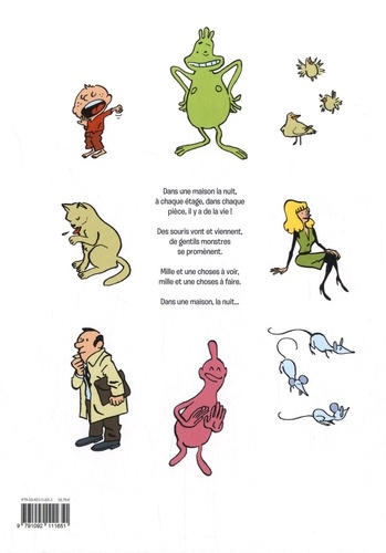 Dans une maison la nuit, à chaque étage, dans chaque pièce, il y a de la vie ! Des souris vont et viennent, de gentils monstres se promènent. Mille et une choses à voir, mille et une choses à faire. Dans une maison, la nuit...