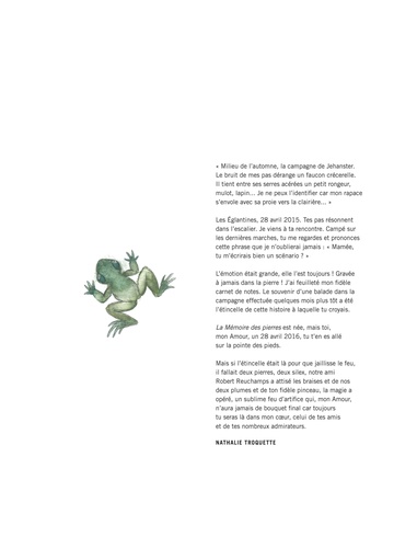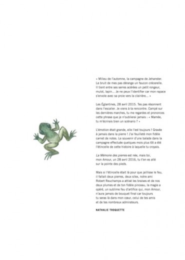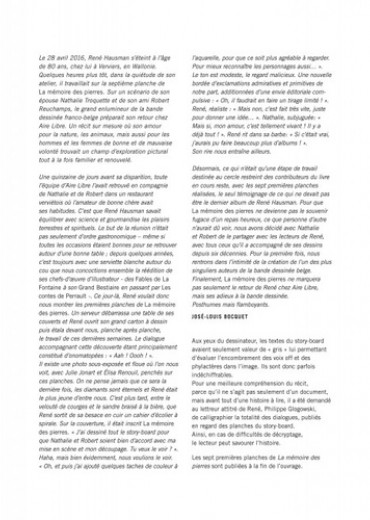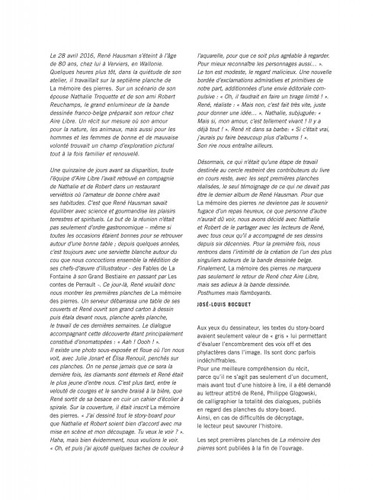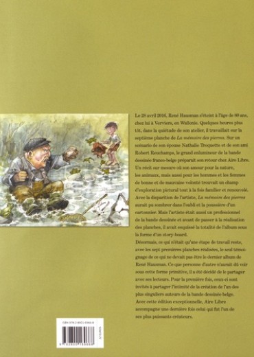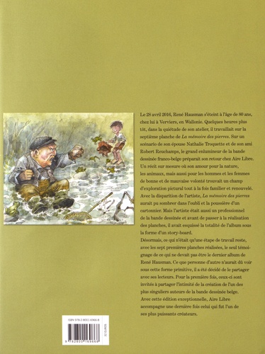 Le 28 avril 2016, René Hausman s'éteint à l'âge de 80 ans, chez lui à Verviers, en Wallonie. Quelques heures plus tôt, dans la quiétude de son atelier, il travaillait sur la septième planche de La mémoire des pierres. Sur un scénario de son épouse Nathalie Troquette et de son ami Robert Reuchamps, le grand enlumineur de la bande dessinée franco-belge préparait son retour chez Aire Libre. Un récit sur mesure où son amour pour la nature, les animaux, mais aussi pour les hommes et les femmes de bonne et de mauvaise volonté trouvait un champ d'exploration pictural tout à la fois familier et renouvelé. Avec la disparition de l'artiste, La mémoire des pierres aurait pu sombrer dans l'oubli et la poussière d'un cartonnier. Mais l'artiste était aussi un professionnel de la bande dessinée et avant de passer à la réalisation des planches, il avait esquissé la totalité de l'album sous la forme d'un story-board. Désormais, ce qui n'était qu'une étape de travail reste, avec les sept premières planches réalisées, le seul témoignage de ce qui ne devait pas être le dernier album de René Hausman. Ce que personne d'autre n'aurait dû voir sous cette forme primitive, il a été décidé de le partager avec ses lecteurs. Pour la première fois, ceux-ci sont invités à partager l'intimité de la création de l'un des plus singuliers auteurs de la bande dessinée belge. Avec cette édition exceptionnelle, Aire Libre accompagne une dernière fois celui qui fut l'un de ses plus puissants créateurs.