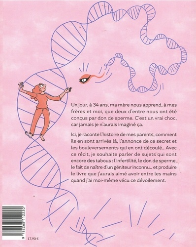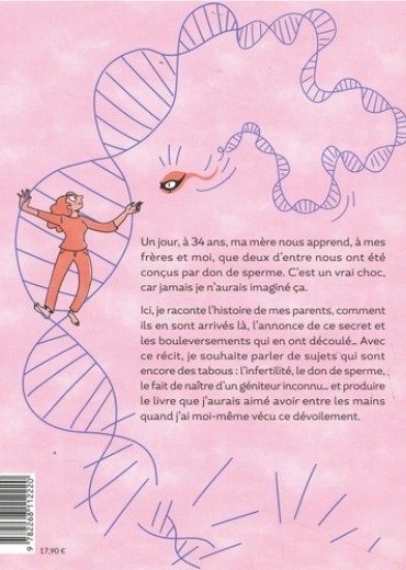 Un jour, à 34 ans, ma mère nous apprend, à mes frères et moi, que deux d'entre nous ont été conçus par don de sperme. C'est un vrai choc, car jamais je n'aurais imaginé ça. Ici, je raconte l'histoire de mes parents, comment ils en sont arrivés là, l'annonce de ce secret et les bouleversements qui en ont découlé... Avec ce récit, je souhaite parler de sujets qui sont encore des tabous : l'infertilité, le don de sperme, le fait de naître d'un géniteur inconnu... et produire le livre que j'aurais aimé avoir entre les mains quand j'ai moi-même vécu ce dévoilement. En plus d'être une meuf en paillettes, Laure Barrière est aussi graphiste et illustratrice. Du sketchnoting à la didactique visuelle, elle utilise le dessin pour illustrer des propos ou expliquer des trucs compliqués.