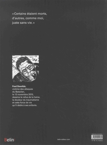 Fred Dewilde est un homme de la résilience. Il a vécu de l'intérieur les attentats qui ont plongé la France dans un état de sidération. Quelques mois après l'attaque du Bataclan, il tente de renouer avec une vie familiale heureuse et légère. Cependant, l'annonce des attentats de Nice le replongent dans la peur mais aussi le refus de la haine. C'est par le dessin de Fred Dewilde a choisi d'exprimer les échos et les mécanismes du traumatisme. Pour lui, et plus encore pour ses enfants, il raconte la douleur qui envahit les victimes de cette guerre d'un genre nouveau… Profondément blessé, il lutte contre le désir de vengeance. Chaque planche de cette bande dessinée donne à voir toute l'humanité d'un des survivants du terrorisme contemporain.