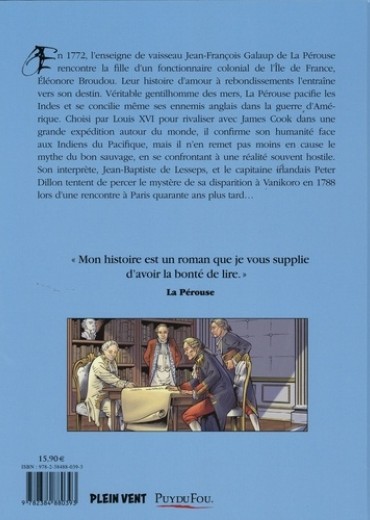 En 1772, l'enseigne de vaisseau Jean-François Galaup de La Pérouse rencontre la fille d'un fonctionnaire colonial de l'île de France, Eléonore Broudou. Leur histoire d'amour à rebondissements l'entraîne vers son destin. Véritable gentilhomme des mers, La Pérouse pacifie les Indes et se concilie même ses ennemis anglais dans la guerre d'Amérique. Choisi par Louis XVI pour rivaliser avec James Cook dans une grande expédition autour du monde, il confirme son humanité face aux Indiens du Pacifique, mais il n'en remet pas moins en cause le mythe du bon sauvage, en se confrontant à une réalité souvent hostile. Son interprète, Jean-Baptiste de Lesseps, et le capitaine irlandais Peter Dillon tentent de percer le mystère de sa disparition à Vanikoro en 1788 lors d'une rencontre à Paris quarante ans plus tard... "Mon histoire est un roman que je vous supplie d'avoir la bonté de lire". La Pérouse