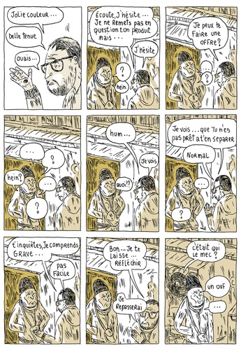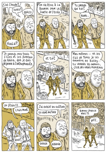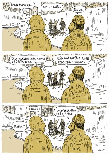 Vie et survie dans la petite couronne. Loin des gros titres anxiogènes des médias et des banlieues qui brûlent, selon certains politiques, si on allait écouter ceux qui y vivent ; suivre les traces de ces pères de famille, entre les courses, les gamins à conduire au sport et les déménagements nocturnes. Ils ont bien grandi les gamins de TMLP (Ta mère la pute, paru en 2011), aujourd'hui ce sont les pères et les grands frères de la communauté. Et s'il y a toujours un crétin qui vend du shit dans le hall de l'immeuble, ils ont une solution pour lui pourrir le business. Ils sont plus démunis face à la BAC qui met les pinces aux jeunes chiens fous, et se contentent de serrer les poings de rage. Ils n'oublient pas qu'il y a plus important, comme payer la cantine des gosses. Les gamins sont maintenant des tontons presque assagis, ceux qui veillent que ça ne parte pas en vrille à la moindre connerie. Presque aussi surpris que nous, ils constatent que la garderie a remplacé la garde à vue dans leurs agendas. Le temps a passé sur toute une génération. A la suite de TMLP (les années d'enfances) puis de Temps mort (2008, chronique de la chute sociale), Gilles Rochier replonge dans la chair de son milieu et brosse, avec La petite couronne, le portrait de sa génération, à l'aube de la cinquantaine, de l'expérience plein les poches - y a de la place - et toujours plus d'amour dans les yeux. Une nouvelle édition de Temps mort vient accompagner la sortie de La petite couronne, son nouvel opus urbain.
