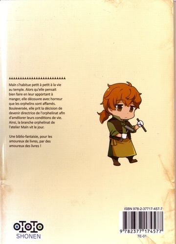 Main s'habitue petit à petit à la vie au temple. Alors qu'elle pensait bien faire en leur apportant à manger, elle découvre avec horreur que les orphelins sont affamés. Bouleversée, elle prit la décision de devenir directrice de l'orphelinat afin d'améliorer leurs conditions de vie. Ainsi, la branche orphelinat de l'atelier Main vit le jour. Une biblio-fantaisie, pour les amoureux de livres, par des amoureux des livres !