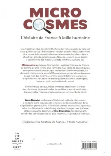 Qui n'a jamais rêvé d'explorer l'histoire de France auprès de celles et ceux qui l'ont vécue ? De l'arpenter " au ras du sol " ? Nous l'observons plus souvent du sommet , à hauteur des souverains, des " héros " et autres " grands personnages ". Nous la scrutons aussi de loin : c'est l'histoire des masses, soldats, femmes, ouvriers, etc. Microcosmes privilégie l'immersion : explorer l'histoire de France du dedans , pour la rendre plus familière. Aux côtés de douze figures, anonymes ou méconnues, qui, tapies dans l'ombre du passé, lui donnent chair comme jamais ! Douze microcosmes, douze époques, douze mondes incarnés, comme autant d'allers-retours entre la " grande " et la " petite " histoire qui complètent et interrogent, loupe en main, notre vision du passé. Entre chaque époque, treize entractes présentent le travail des historiens, leurs méthodes, leurs débats, leurs incertitudes... Car connaître l'histoire, c'est aussi savoir comment elle s'écrit. Yann Bouvier , professeur d'histoire et vidéaste bien connu, a imaginé dans ces pages la rencontre de la microstoria et de la vulgarisation grand public. Il livre ici des textes accessibles, rigoureux, relus par d'éminents spécialistes, et mis en images avec justesse et légèreté par le dessinateur Eloi Chevallier . Un récit vivant, enrichi des connaissances les plus récentes... et ponctué d'humour. (Re)découvrez l'histoire de France... à taille humaine ! Préfacé par Alain Corbin De 14 à 99 ans ! SOMMAIRE : Gaule romaine - Caius Iulius Vindex Moyen Age central - Adémar de Chabannes Moyen Age tardif - Le Bourgeois de Paris Renaissance française - Antoine Escalin, dit le Polin L'absolutisme - Claude Brousson La Révolution - Solitude D'un Empire à l'autre - Louis-François Pinagot La Commune de Paris - Nathalie Le Mel, née Duval La Première Guerre mondiale - Frédéric Branche Les années folles - Mireille Havet La Seconde Guerre mondiale - Jeanine Morisse, alias Niquou Histoire du temps présent - Zakia