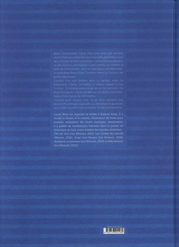 Après Delicatessen, Lucas Nine nen avait pas terminé avec le Paris des années 20 et sa fable animalière sous des contours de récit fantastique. La Peur Emeraude peut se lire comme une histoire à part ou comme la suite de Delicatessen, avec les principaux protagonistes, le journaliste René Dulac, linfâme Henri Le Cochon, les petites danseuses. Lauteur tisse son histoire dans la capitale, entre La Salpetrière, lOpéra, Les Halles, le célèbre cabaret Le Gai Cochon. Un étrange personnage qui se fait nommer "La Peur Emeraude" tente de déjouer les plans machiavéliques dune bande de criminelles. Comme pour chaque livre, Lucas Nine parsème son oeuvre dhommages appuyés à la littérature et au dessin comme Fantomas ou Fantagas pour cette nouvelle histoire truffée de rebondissements.