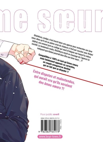 Shishikura, oméga s'est inscrit dans une agence pour rechercher son âme soeur. Alors qu'il est en pleine crise de chaleurs, il finit par coucher avec Kotani (alpha), son ennemi juré au collège qui vient d'intégrer par hasard la même société. Le lendemain matin, Shishikura reçoit un message de l'agence lui indiquant que Kotani pourrait bien être son âme soeur...? ! Compatibles à 100% en tant qu'âmes soeurs, mais totalement opposés en caractère, un couple omegaverse destiné qui ne fait que se disputer !! Entre disputes et malentendus, qui aurait cru qu'ils seraient des âmes soeurs ?