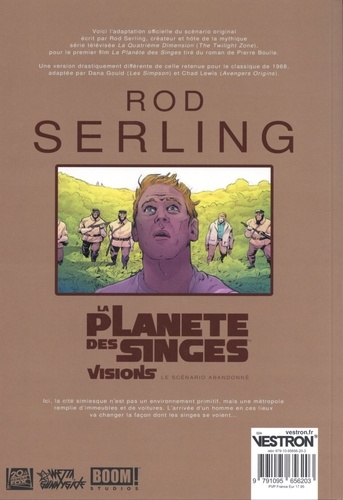 Le scénario original que Rod Serling avait imaginé pour le premier film inspiré du roman de Pierre Boulle, La Planète des Singes (1968), est enfin révélé et adapté en BD par Dana Gould (scénariste et producteur de la série TV Les Simpsons) et Chad Lewis (Avengers Origins). "Thomas arrive sur La Planète des Singes, un endroit qui n'a rien de primitif ... Ici les immeubles pointent vers les cieux et les routes sont bondées d'automobiles. L'arrivée de cet homme va changer la façon dont les singes - et les humains- se voient".