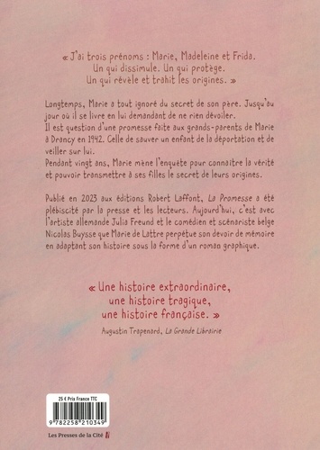 L'adaptation graphique de La Promesse , l'enquête intime de l'autrice sur l'histoire tragique de sa famille. " J'ai trois prénoms : Marie, Madeleine et Frida. Un qui dissimule. Un qui protège. Un qui révèle et trahit les origines. " Longtemps, Marie a tout ignoré du secret de son père. Jusqu'au jour où il se livre en lui demandant de ne rien dévoiler. Il est question d'une promesse faite aux grands-parents de Marie à Drancy en 1942. Celle de sauver un enfant de la déportation et de veiller sur lui. Pendant vingt ans, Marie mène l'enquête pour connaître la vérité et pouvoir transmettre à ses filles le secret de leurs origines. Publié en 2023 aux éditions Robert Laffont, La Promesse a été plébiscité par la presse et les lecteurs. Aujourd'hui, c'est avec l'artiste allemande Julia Freund et le comédien et scénariste belge Nicolas Buysse que Marie de Lattre perpétue son devoir de mémoire en adaptant son histoire sous la forme d'un roman graphique. " Une histoire extraordinaire, une histoire tragique, une histoire française. " - ; Augustin Trapenard, La Grande Librairie " C'est la plus incroyable histoire de famille qu'on puisse imaginer. " - ; Etienne de Montety, Le Figaro littéraire " D'une splendide écriture, tout en retenue et colère, Marie de Lattre brise les silences de ce passé qui hante. " - ; Ariane Singer, Le Monde des livres " Cette histoire sublime, au dénouement inattendu, dit l'amour absolu. Ne passez pas à côté. " - ; Gaëtane Morin, Le Parisien