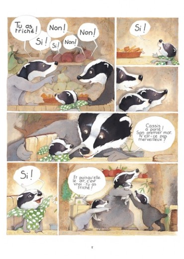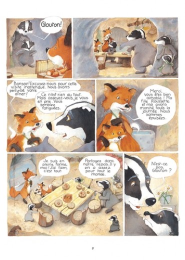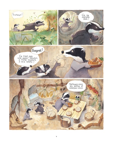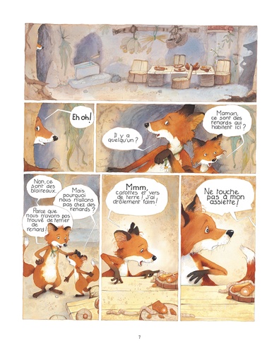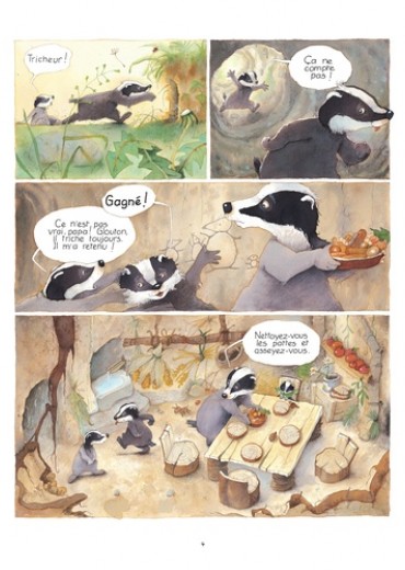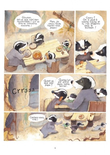 Quand une maman Renard et sa fille Roussette entrent sans prévenir dans la maison d'une famille de blaireaux, tout ça parce qu'un chasseur a découvert leur terrier, que croyez-vous qu'il arrive ? Eh bien, les enfants sympathisent et jouent ensemble tandis que les adultes prennent des décisions d'adultes : ils se mettent d'accord pour s'installer dans le même terrier, parce que celui de maman Renard a été détruit par les chasseurs. L'embêtant, c'est que les blaireaux et les renards n'ont rien en commun. Mais est-ce vraiment si embêtant ? Première incursion des Editions Dargaud dans le livre Jeunesse, Monsieur Blaireau et Madame Renard est un régal ! La douceur du trait, la beauté des couleurs et la luminosité des planches font de cet album un vrai bonheur. Les plus petits seront ravis de découvrir l'histoire de cette famille pas comme les autres, où l'amitié finit par l'emporter sur les inévitables chamailleries d'enfants. Quant aux adultes, ils pourront y lire une invitation à la différence et l'écho des évolutions de la société d'aujourd'hui, entre familles recomposées et couples mixtes. En refermant le livre, le lecteur se dit qu'il aimerait bien, lui aussi, s'installer chez la famille Blaireau... Chaque tome de la série sera dorénavant proposé à partir de 2026 en version souple à plus petit format (195 x 260) avec un bonus de huit pages supplémentaires (jeux, cahier didactique...). Le tout à petit prix !