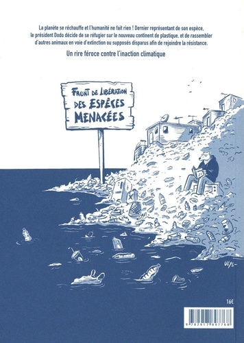 La planète se réchauffe et l'humanité ne fait rien ! Dernier représentant de son espèce, le président Dodo décide de se réfugier sur le nouveau continent de plastique, et de rassembler d'autres animaux en voie d'extinction ou supposés disparus afin de rejoindre la résistance. Un rire féroce contre l'inaction climatique.