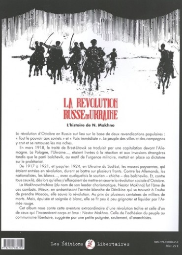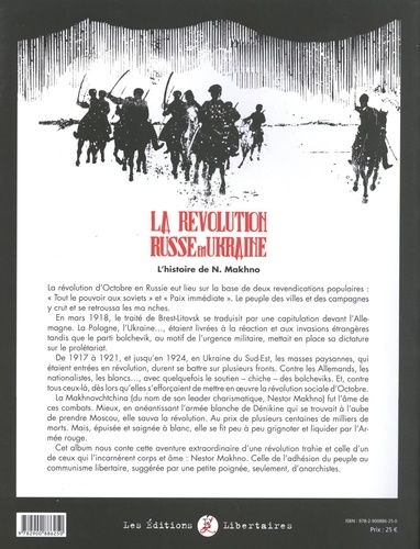 La révolution d'Octobre en Russie eut lieu sur la base de deux revendications populaires : "Tout le pouvoir aux soviets" et "Paix immédiate". Le peuple des villes et des campagnes y crut et se retroussa les manches. En mars 1918, le traité de Brest-Litovsk se traduisit par une capitulation devant l'Allemagne. La Pologne, l'Ukraine..., étaient livrées à la réaction et aux invasions étrangères tandis que le parti bolchevik, au motif de l'urgence militaire, mettait en place sa dictature sur le prolétariat. De 1917 à 1921, et jusqu'en 1924, en Ukraine du Sud-Est, les masses paysannes, qui étaient entrées en révolution, durent se battre sur plusieurs fronts. Contre les Allemands, les nationalistes, les blancs..., avec quelquefois le soutien - chiche - des bolcheviks. Et, contre tous ceux-là, dès lors qu'elles s'efforçaient de mettre en oeuvre la révolution sociale d'Octobre. La Makhnovchtchina (du nom de son leader charismatique, Nestor Makhno) fut l'âme de ces combats. Mieux, en anéantissant l'armée blanche de Dénikine qui se trouvait à l'aube de prendre Moscou, elle sauva la révolution. Au prix de plusieurs centaines de milliers de morts. Mais, épuisée et saignée à blanc, elle se fit peu à peu grignoter et liquider par l'Armée rouge. Cet album nous conte cette aventure extraordinaire d'une révolution trahie et celle d'un de ceux qui l'incarnèrent corps et âme : Nestor Makhno. Celle de l'adhésion du peuple au communisme libertaire, suggérée par une petite poignée, seulement, d'anarchistes.