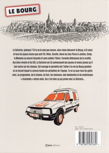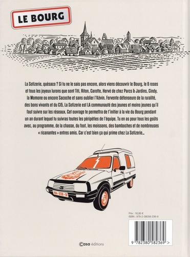 La Sotizerie, quésaco ? Si tu ne le sais pas encore, alors viens découvrir le Bourg, le 6 roses et tous les joyeux lurons que sont Titi, Piton, Carotte, Hervé de chez Parcs & Jardins, Cindy, la Momone ou encore Sacoche et sans oublier l'Kévin. Fervente défenseure de la ruralité, des bons vivants et du C15, La Sotizerie est LA communauté des jeunes et moins jeunes qu'il faut suivre sur les réseaux. Cet ouvrage te permettra de t'initier à la vie du Bourg pendant un an durant lequel tu suivras toutes les péripéties de l'équipe. Tu en as pour tous les goûts avec, au programme, de la chasse, du foot, les moissons, des bamboches et de nombreuses " ricanantes " entres amis. Car c'est bien ça qui prime chez La Sotizerie...