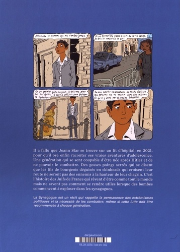 Il a fallu que Joann Sfar se trouve sur un lit d'hôpital, en 2021, pour qu'il ose enfin raconter ses vraies aventures d'adolescence. Une génération qui se sent coupable d'être née après Hitler et de ne pouvoir le combattre. Des gosses poings serrés qui se disent que les fils de bourgeois déguisés en skinheads qui croisent leur route ne seront pas des ennemis à la hauteur de leur chagrin. C'est l'histoire des Juifs de France qui rêvent d'être comme tout le monde mais ne savent pas comment se rendre utiles lorsque des bombes commencent à exploser dans les synagogues. La Synagogue est un récit qui rappelle la permanence des extrémismes politiques et la nécessité de les combattre, même si cette lutte doit être recommencée à chaque génération.