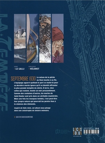 Septembre 1930. La saison de la pêche au thon touche à sa fin. L'équipage aguerri quittant le port ce matin-là pour sa dernière marée ignore qu'il va bientôt affronter la plus grande tempête du siècle. A terre, chez celles qui restent, monte un noir pressentiment. Comme des centaines d'autres, les marins du Saint-Budoc sont pris dans un véritable maelström. Mais une fois les masques tombés, c'est peut-être leur propre nature qui pourrait les perdre face la violence des éléments. Inspiré de faits réels, cet album nous plonge dans une catastrophe de sinistre mémoire.