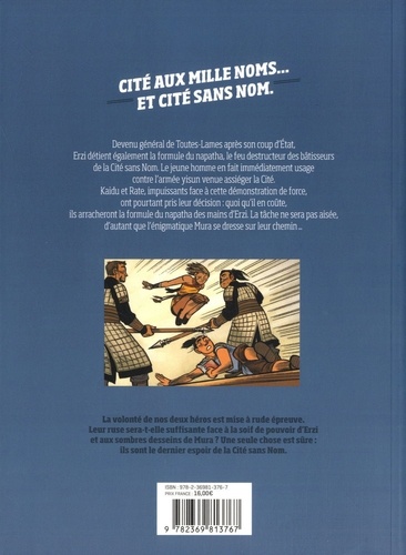 Devenu général de Toutes-Lames après son coup d'Etat, Erzi détient également la formule du napatha, le feu destructeur des bâtisseurs de la Cité sans Nom. Le jeune homme en fait immédiatement usage contre l'armée yisun venue assiéger la Cité. Kaidu et Rate, impuissants face à cette démonstration de force, ont pourtant pris leur décision : quoi qu'il en coûte, ils arracheront la formule du napatha des mains d'Erzi. La tâche ne sera pas aisée, d'autant que l'énigmatique Mura se dresse sur leur chemin... La volonté de nos deux héros est mise à rude épreuve. Leur ruse sera-t-elle suffisante face à la soif de pouvoir d'Erzi et aux sombres desseins de Mura ? Une seule chose est sûre : ils sont le dernier espoir de la Cité sans Nom.