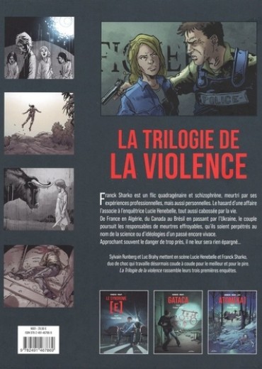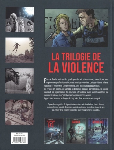 De France en Algérie, du Canada au Brésil en passant par l'Ukraine, Frank Sharko et Lucie Henebelle poursuivent les responsables de meurtres effroyables, perpétrés au nom de la Science ou d'idéologies douteuses. Ce duo de choc travaille désormais ensemble pour le meilleur et pour le pire, La Trilogie de la violence rassemble leurs trois premières enquêtes. Le commissaire Frank Sharko est un flic quarantainaire et schizophrène, meurtri par ses expériences professionnelles, mais aussi personnelles. C'est dans "Le Syndrome [E]" qu'il est associé pour la première fois à l'enquêtrice Lucie Henebelle, tout aussi cabossée par la vie. De France en Algérie, du Canada au Brésil en passant par l'Ukraine, le couple poursuit les responsables de meurtres effroyables, qu'ils soient perpétrés au nom de la Science ou d'idéologies d'un passé encore vivace. Approchant souvent le danger de trop près, rien ne leur est épargné... Ce duo de choc travaille désormais ensemble pour le meilleur et pour le pire, La Trilogie de la violence rassemble leurs trois premières enquêtes.
