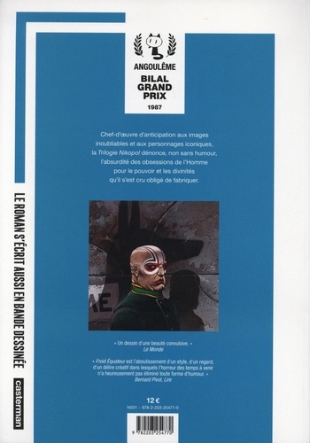 Chef-d'oeuvre d'anticipation aux images inoubliables et aux personnages iconiques (Alcide Nikopol et Jill Bioskop, entre autres), La Trilogie Nikopol dénonce, non sans humour, l'absurdité des obsessions de pouvoir de l'Homme et des divinités qu'il n'a pu s'empêcher de se fabriquer.