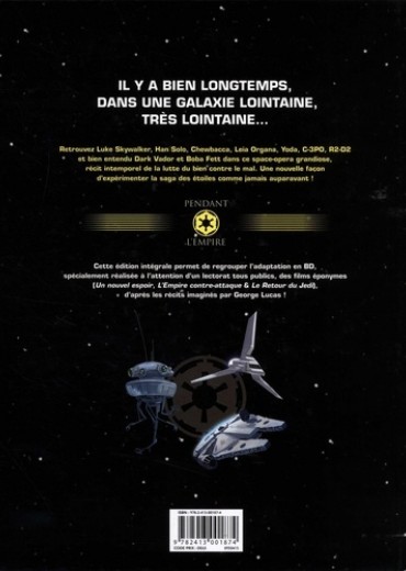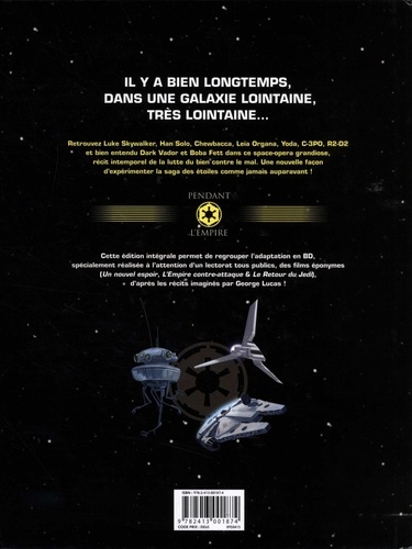Il y a bien longtemps, dans une galaxie lointaine, très lointaine... Retrouvez Luke Skywalker, Han Solo, Chewbacca, Leia Organa, Yoda, C-3PO, R2-D2 et bien entendu Dark Vador et Boba Fett dans ce space-opera grandiose, récit intemporel de la lutte du bien contre le mal. Une nouvelle façon d'expérimenter la saga des étoiles comme jamais auparavant ! Cette édition intégrale permet de regrouper l'adaptation en BD, spécialement réalisée à l'attention d'un lectorat tous publics, des films éponymes (Un nouvel espoir, L'Empire contre-attaque & Le Retour du Jedi), - d'après les récits imaginés par George Lucas !