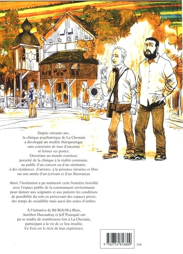 Depuis soixante ans, la clinique psychiatrique de La Chesnaie a développé un modèle thérapeutique sans construire de mur d'enceinte ni fermer ses portes. Ouverture au monde extérieur, porosité de la clinique à la réalité commune, au public d'un concert ou d'un séminaire, à des résidences d'artistes, à la présence itérative et libre sur une année d'un écrivain et d'un illustrateur. Ainsi, l'institution a pu maintenir cette frontière invisible avec l'espace public de la communauté environnante pour donner aux soignants et aux patients les conditions de possibilité du soin en préservant des espaces privés, des temps de sociabilité mais aussi des zones d'ombre. A l'initiative de Bd BOUM à Blois, Aurélien Ducoudray et Jeff Pourquié ont pu se rendre de nombreuses fois à La Chesnaie, participant à la vie de ce lieu insolite. Ce livre est le récit de leur expérience.