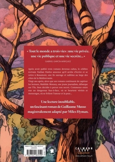 "Tout le monde a trois vies : une vie privée, une vie publique et une vie secrète. . ". GABRIEL GARCIA MARQUEZ Après avoir publié trois romans devenus cultes, le célèbre écrivain Nathan Fawles annonce qu'il arrête d'écrire et se retire à Beaumont, une île sauvage et sublime au large des côtes de la Méditerranée. Vingt ans après, alors que ses romans continuent de captiver les lecteurs, Mathilde Monney, une jeune journaliste, débarque sur l'île, bien décidée à percer son secret. Commence entre eux un dangereux face-à-face, où se heurtent vérités et mensonges, où se frôlent l'amour et la peur... Une lecture inoubliable, un fascinant roman de Guillaume Musso magistralement adapté par Miles Hyman.